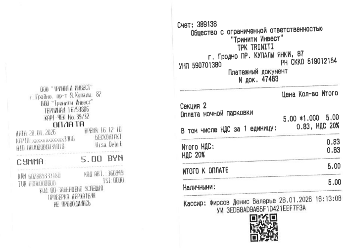 В случае, если Вы не получили парковочный талон в СМС сообщении от triniti.by (проверьте в папке спам), что привело к предъявлению вам притензии о неоплате (не оказана услуга), Вам необходимо обратиться (в службу технической поддержки) по телефонам +375 44 526 00 01 или e-mail parking@triniti-grodno.by .